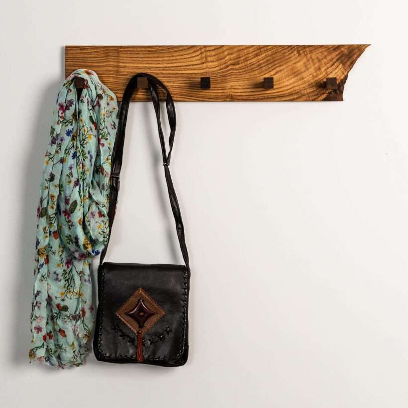 Drveni čiviluk za hodnik napravljen od drveta sofore. Originalan, sa live edge ivicom.
